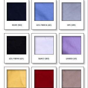 Azul Francia, Lavanda, Blanco, Gris, Kakhi, Azul Marino, Negro, Rojo, Amarillo